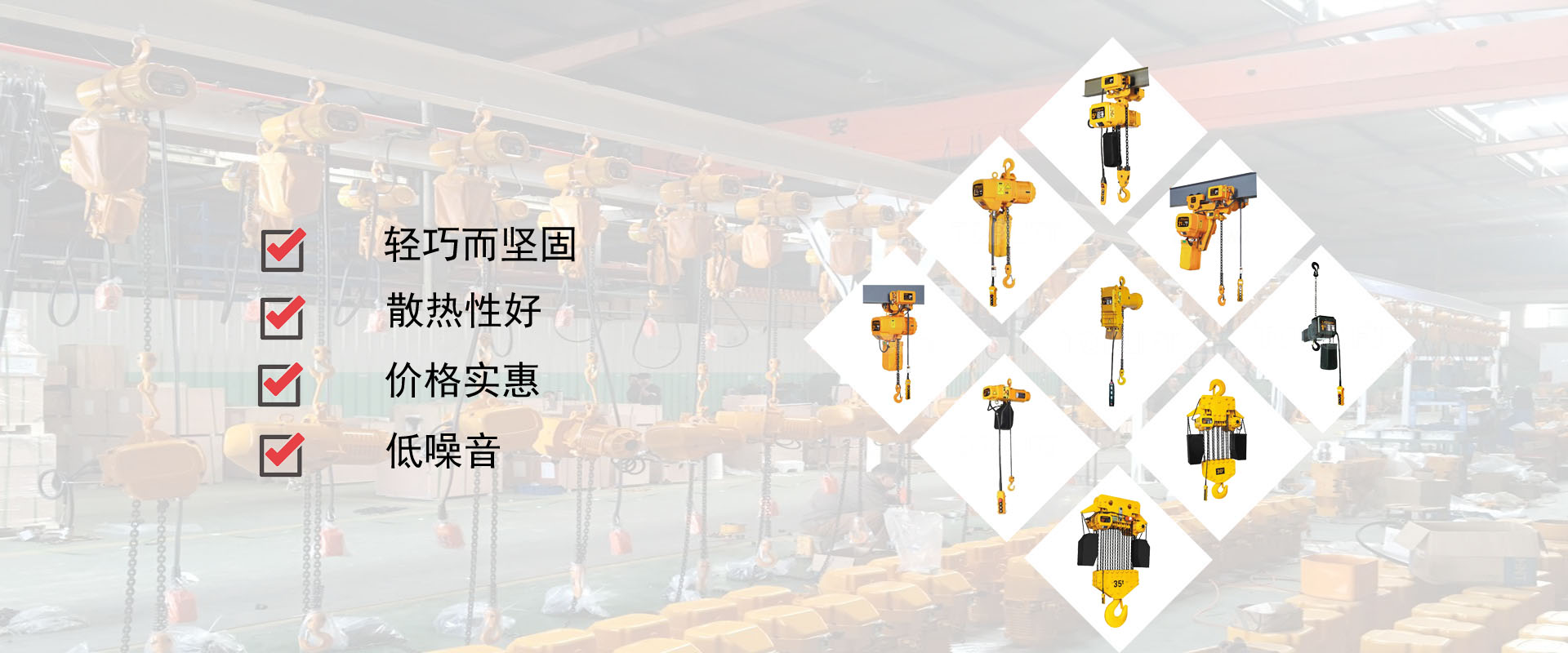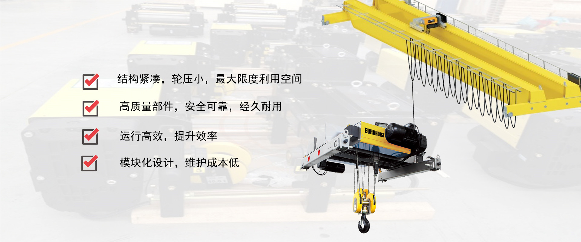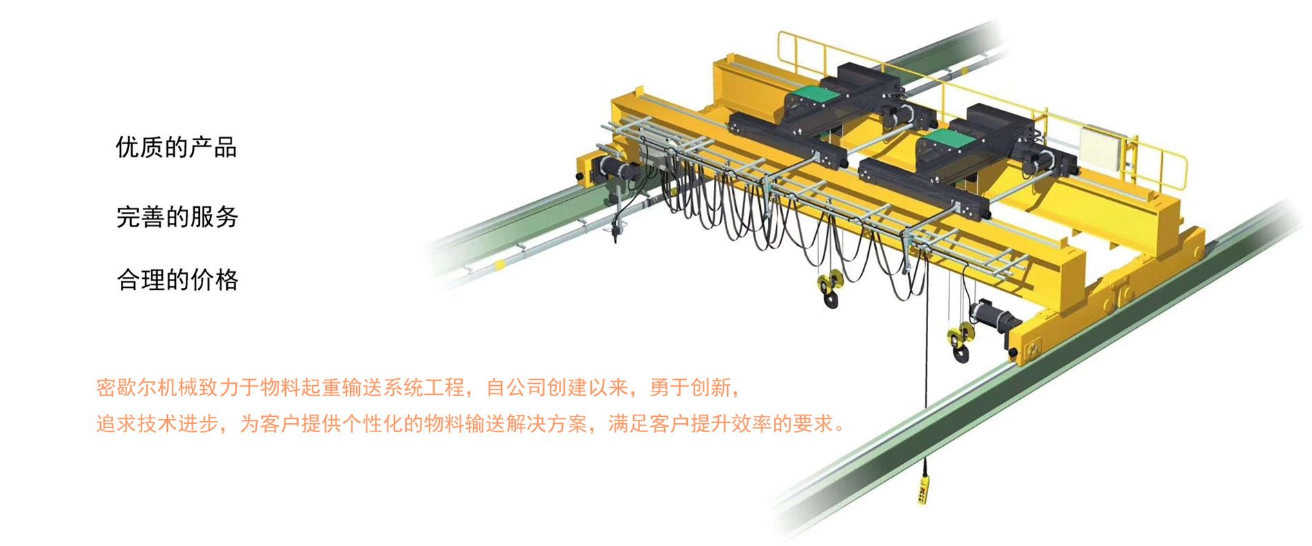 密歇爾起重機械(杭州)有限公司提供全面的起重輸送產(chǎn)品和服務,產(chǎn)品覆蓋環(huán)鏈電動葫蘆(125Kg-80T),歐式鋼絲繩葫蘆,防爆葫蘆,懸臂吊,KBK柔性起重機,歐式起重機,起重馬達,端梁,起重移動供電系統(tǒng)等,在國內(nèi)外被廣泛的應用于生產(chǎn)車間,汽車,模具,機械制造,鐵路,船舶,物流搬運,現(xiàn)代化工廠流水線等工業(yè)及其它特殊用途。